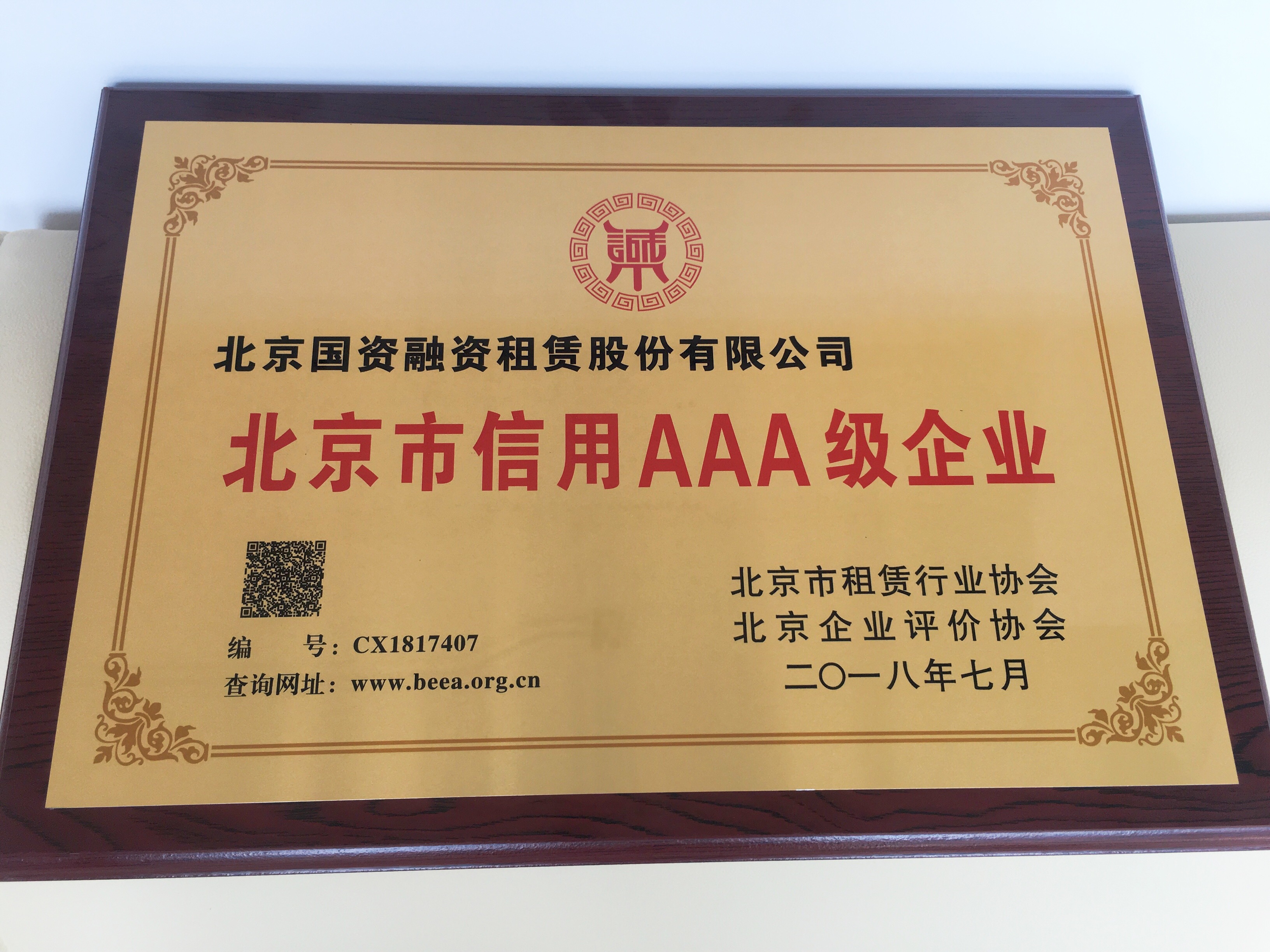 此次被列为信用AAA企业是在2017年获得“北京市诚信创建企业”称号后,北京国资租赁再次得到政府、行业和社会的肯定。