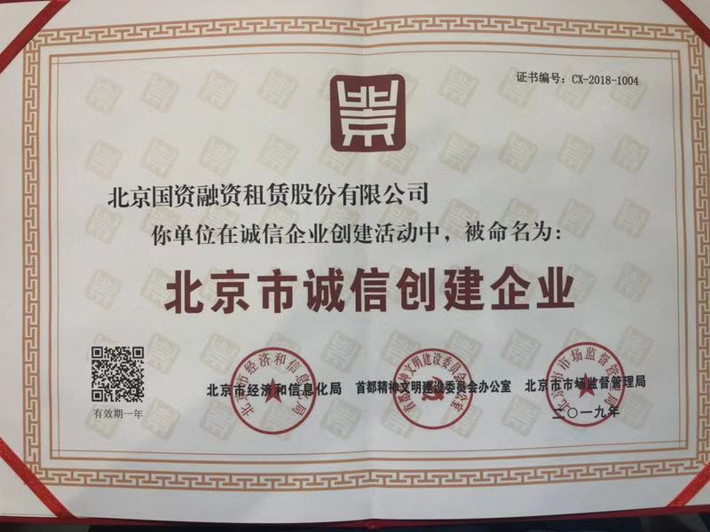 近日,北京国资融资租赁股份有限公司获评2019年“北京市诚信创建企业” 。