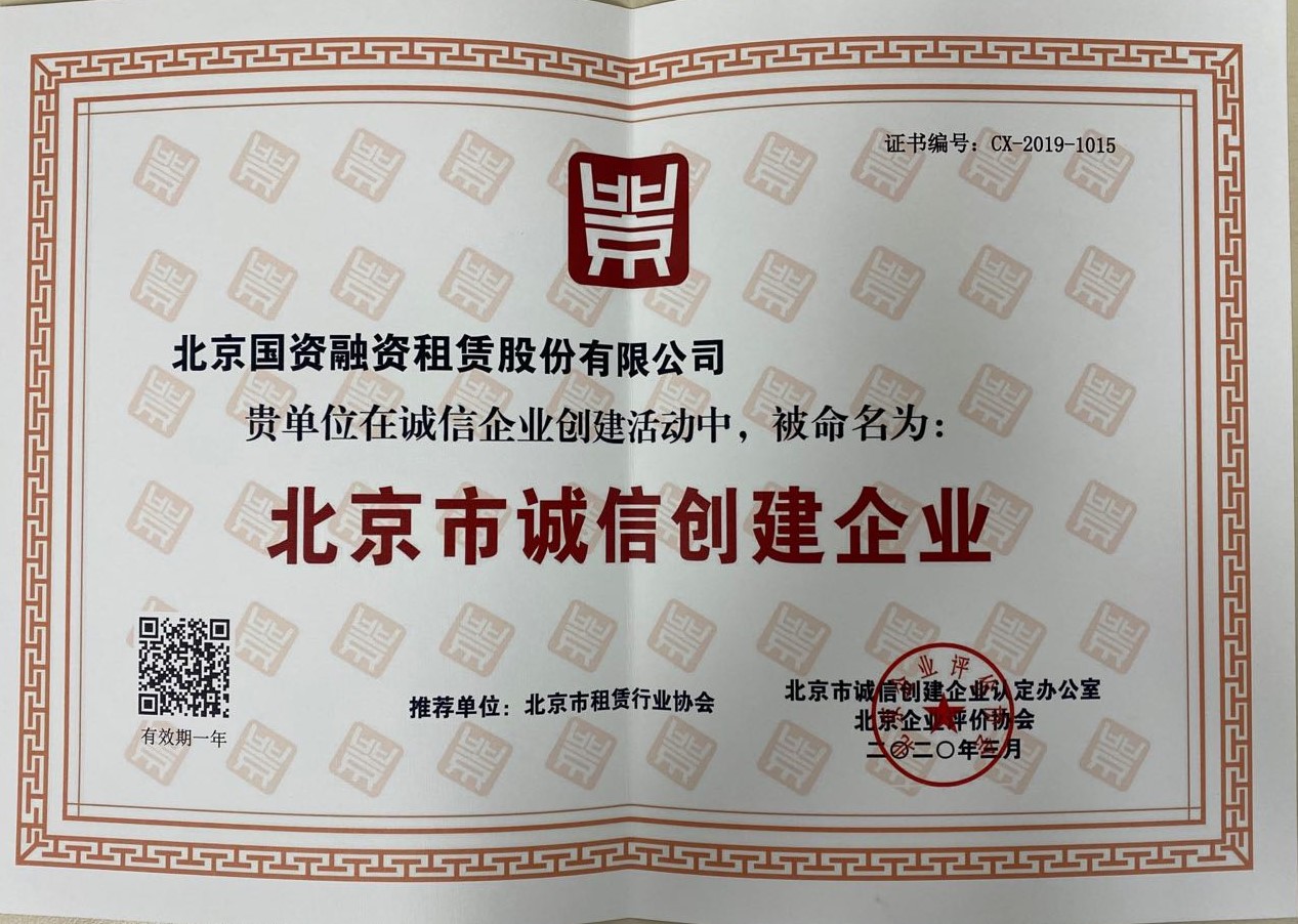 北京国资融资租赁股份有限公司三度获评北京市诚信创建企业