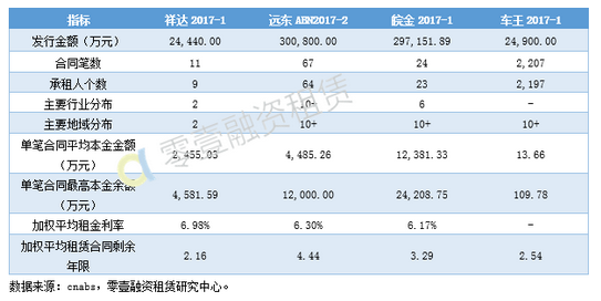 7月发行的租赁ABS中,资产集中度差异较大。其中资产分散度最高的是车王2017-1产品,主要由汽车租赁这一小而分散的基础资产特质决定的。而祥达2017-1在行业和地域两方面资产分散度均较低,加权平均租金利率为7月发行的4单中最高。此外,远东ABN2017-2与皖金2017-1两单产品发行金额相近,前者资产分散度显著高于后者,但合同剩余期限较长, 达4.44年。