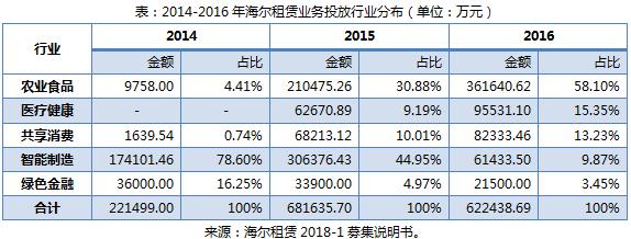 海尔租赁近年重点布局农业租赁,投放额逐年上升,2016年投放额达36.16亿元,占总投放额58.1%。